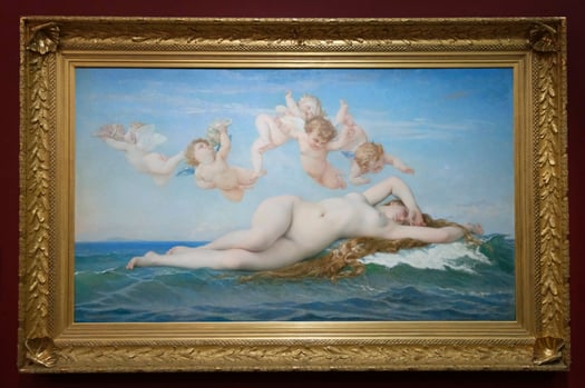 - The Birth of Venus (Alexandre Cabanel): One of the most celebrated Academic paintings of the 19th century, Cabanel’s Birth of Venus epitomizes the idealized beauty and sensuality of the period. The soft, luminous skin tones, the dreamlike quality of the sea foam, and Venus’ reclining pose make this a masterpiece of the beaux-arts tradition. The painting was adored by Napoleon III, and its delicate eroticism and technical perfection continue to enchant viewers today.