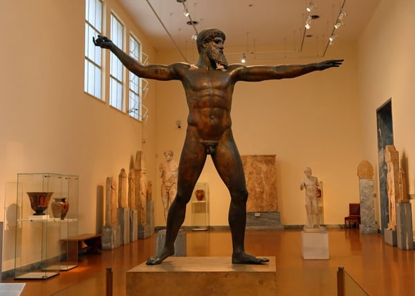 - Bronze Statue of Poseidon or Zeus? (Artemision Bronze): Towering over the other sculptures in the room, at nearly 7 feet (2.09 meters) tall, this dramatic bronze sculpture was retrieved from the sea near Cape Artemision, which is why it is now known as the Artemision Bronze. The god stands poised to strike, one arm stretched back, the other thrust forward, either holding a trident (if it is Poseidon) or a thunderbolt (if it is Zeus). The original weapon is lost, so scholars still debate which god we are looking at with this sculpture. Regardless, the power and movement captured in the piece make it one of the finest surviving bronzes from antiquity.